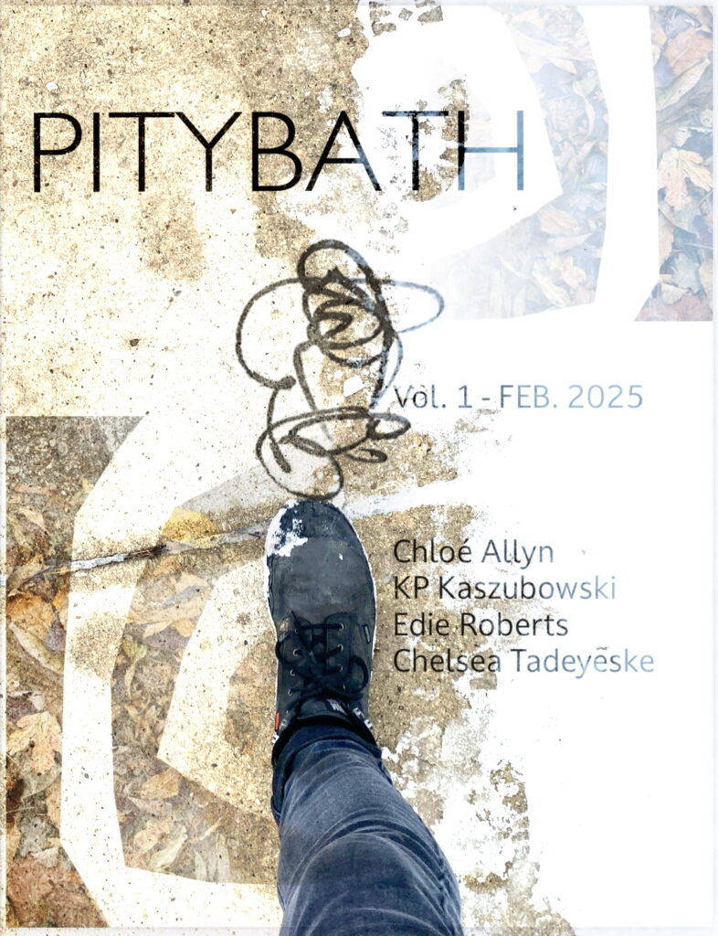 PITYBATH VOL 4 - FEB 2026 Maura Ford | Chris McCreary | W.R. Barshop | Kelly Lorraine Andrews VOL 1 - FEB 2025Chloé Allyn | KP Kaszubowski Edie Roberts | Chelsea Tadeyeske VOL 2 - JUNE 2025Moss Berke | Ewen Glass Jesse McCarty | KD Sims VOL 3 - OCT 2025Joan Tate | William Smythe Nate Hoil | Mira Cameron