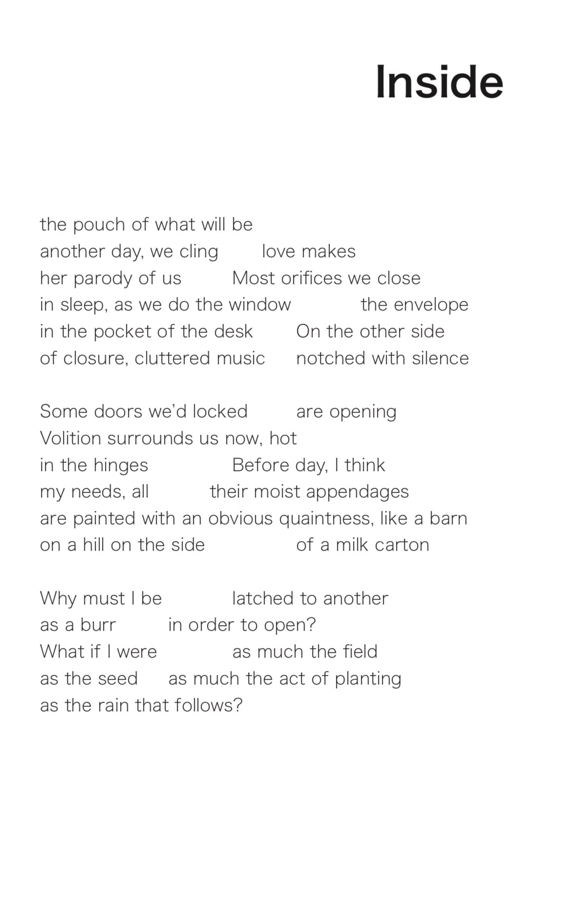 KAMAL E. KIMBALL an Ohio poet. On the editorial team of Muzzle Magazine, she is currently serving as a guest judge for Writer’s Digest. Her work has been published or is forthcoming in Phoebe, Hobart, Cloudbank, Juked, Tahoma Literary Review, Sundog Lit, Bone Parade, Inverted Syntax, Forklift Ohio, and elsewhere. She earned her MFA from The Ohio State University and teaches writing.